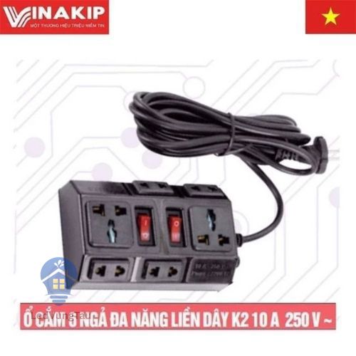 Ổ cắm VINAKIP 6 ngả liền dây ĐN/K2-10A – Dây dài 5 mét, chịu tải cao, an toàn sử dụng